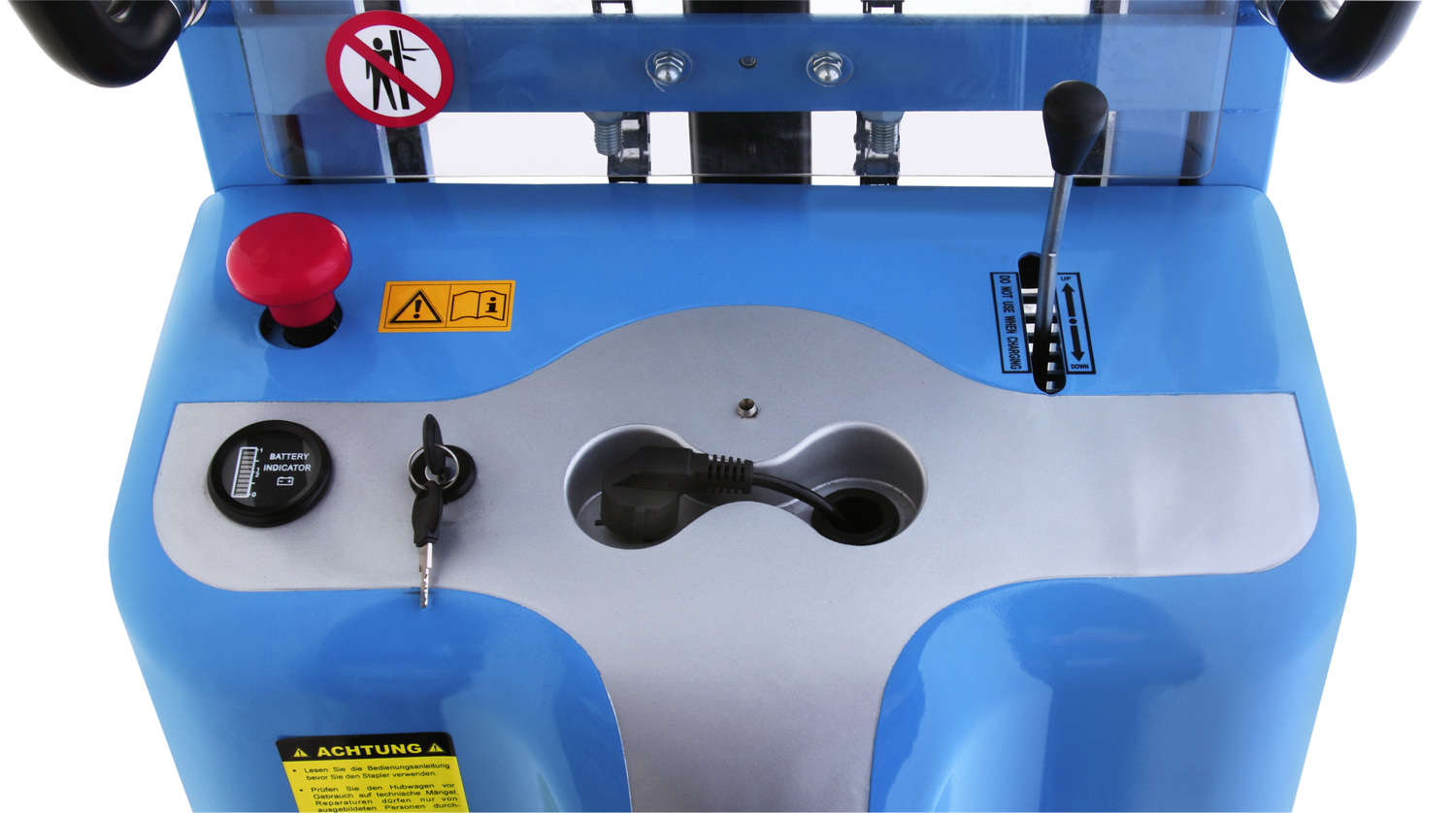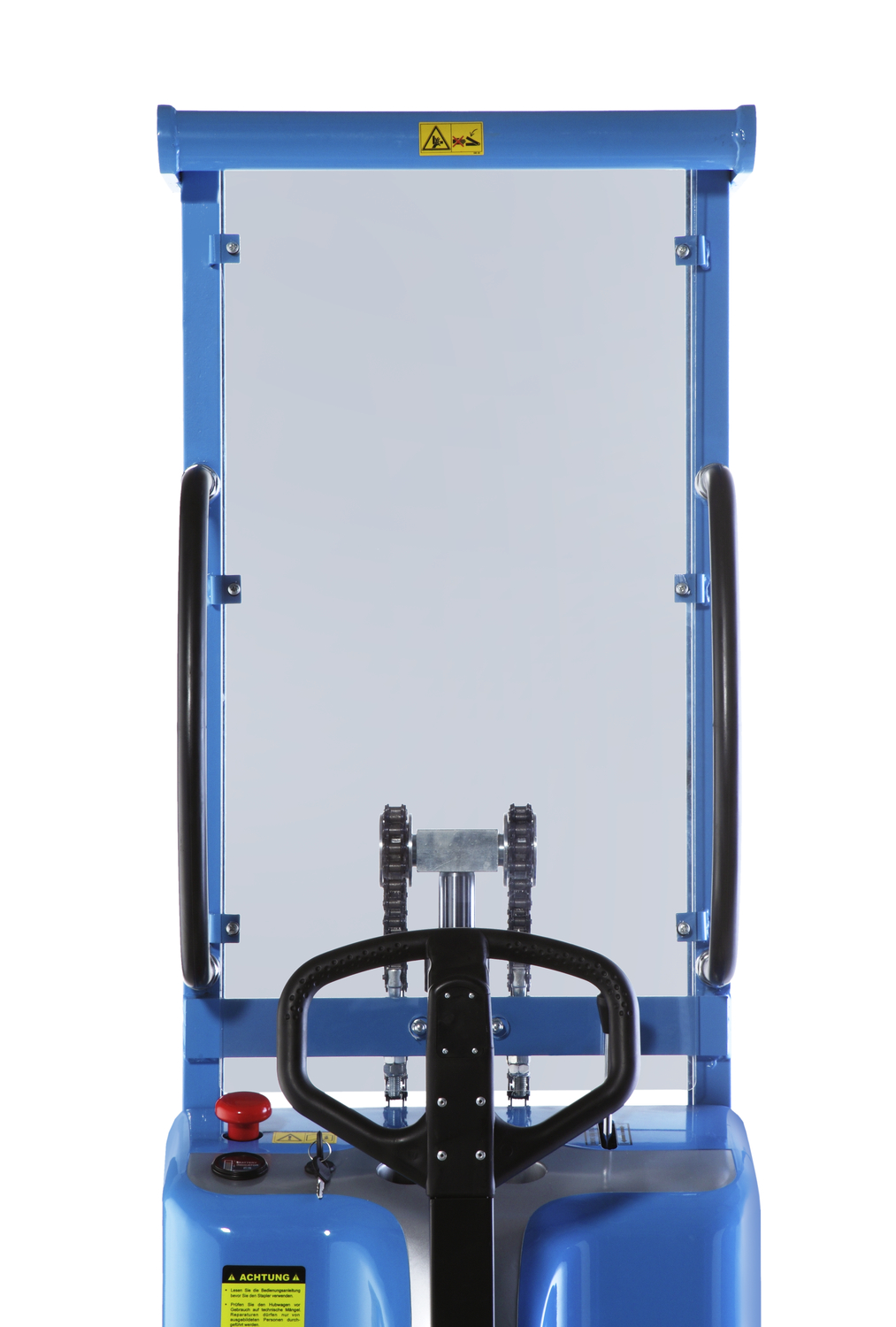 Die Bedienung erfolgt komfortabel über einen Hebel an der Steuerkonsole. Robuste Haltegriffe, eine gummierte Handdeichsel und ein Kettenlenkzug sorgen für optimale Manövrierbarkeit. Ein Schutzgitter schützt den Bediener zusätzlich vor herabfallender Ladung.
