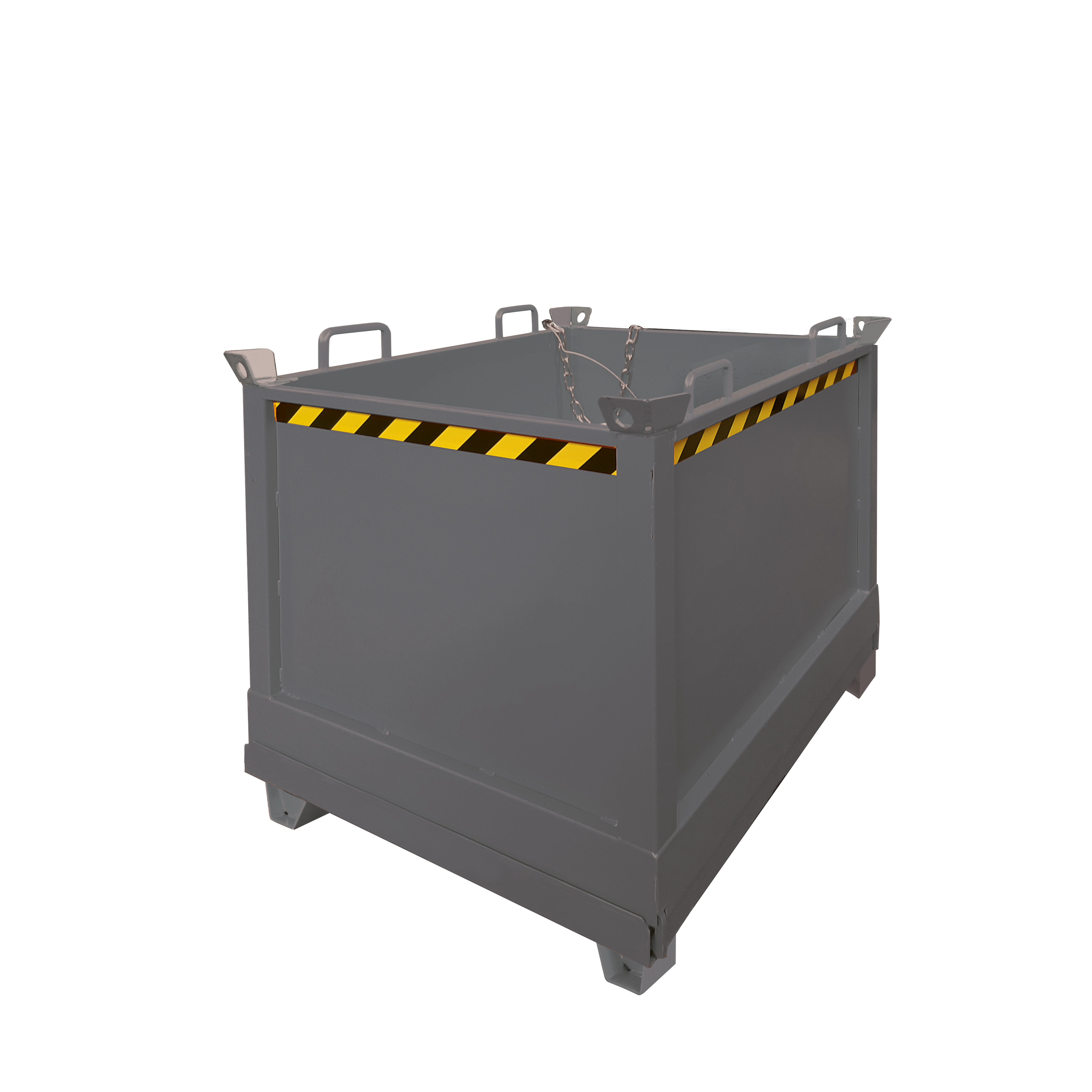 Kastenförmiger Klappbodenbehälter für Stapler mit glatten Innenwänden. Der solide Behälter kann 3-fach gestapelt werden und kann per Stapler und Kran aufgenommen werden. Die Entriegelung der Bodenklappe wird per Seilzug vom Fahrersitz ausgelöst. Beim Aufsetzen auf dem Boden schließt die Bodenklappe wieder selbsttätig. Durch die 100 mm Bodenfreiheit ist der Klappbodenbehälter auch mit Hubwagen verfahrbar. Mit Kettensicherung. Mit 4 Kranösen und Stapelecken. Zubehör: - 2 Lenk- und 2 Bockrollen - Deckel, mehrteilig - Zentrierwände für Bodenklappe