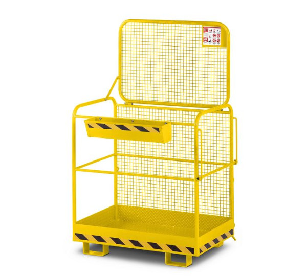 Der Arbeitskorb wird einfach mit den Gabelzinken des Staplers an den Einfahrtaschen aufgenommen und mit einer zusätzlichen Kettensicherung gesichert. Die rutschfeste Arbeitsplatte und die robuste Stahlkonstruktion bieten ein sicheres Arbeiten in großer Höhe.